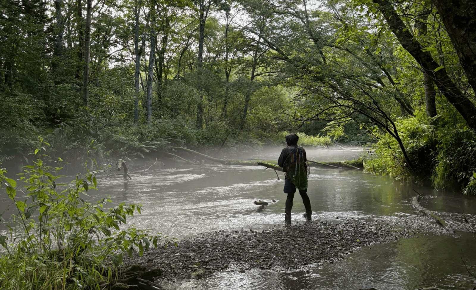 川底の玉石を踏むたび、冷たい水流がウェーダー越しに伝わり、北海道の大自然が全身を包み込む感覚。