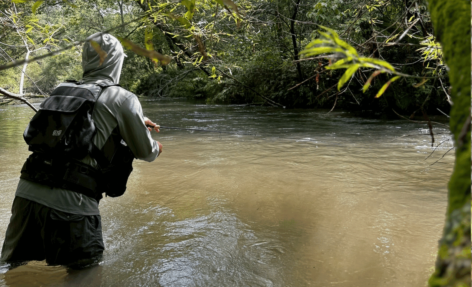 川幅はおよそ10m、水深は1mほど。決して大河ではないものの、倒木や立木が複雑に絡み合うストラクチャーが幾重にも連なり、その陰には確かに魚の気配が漂っていました。