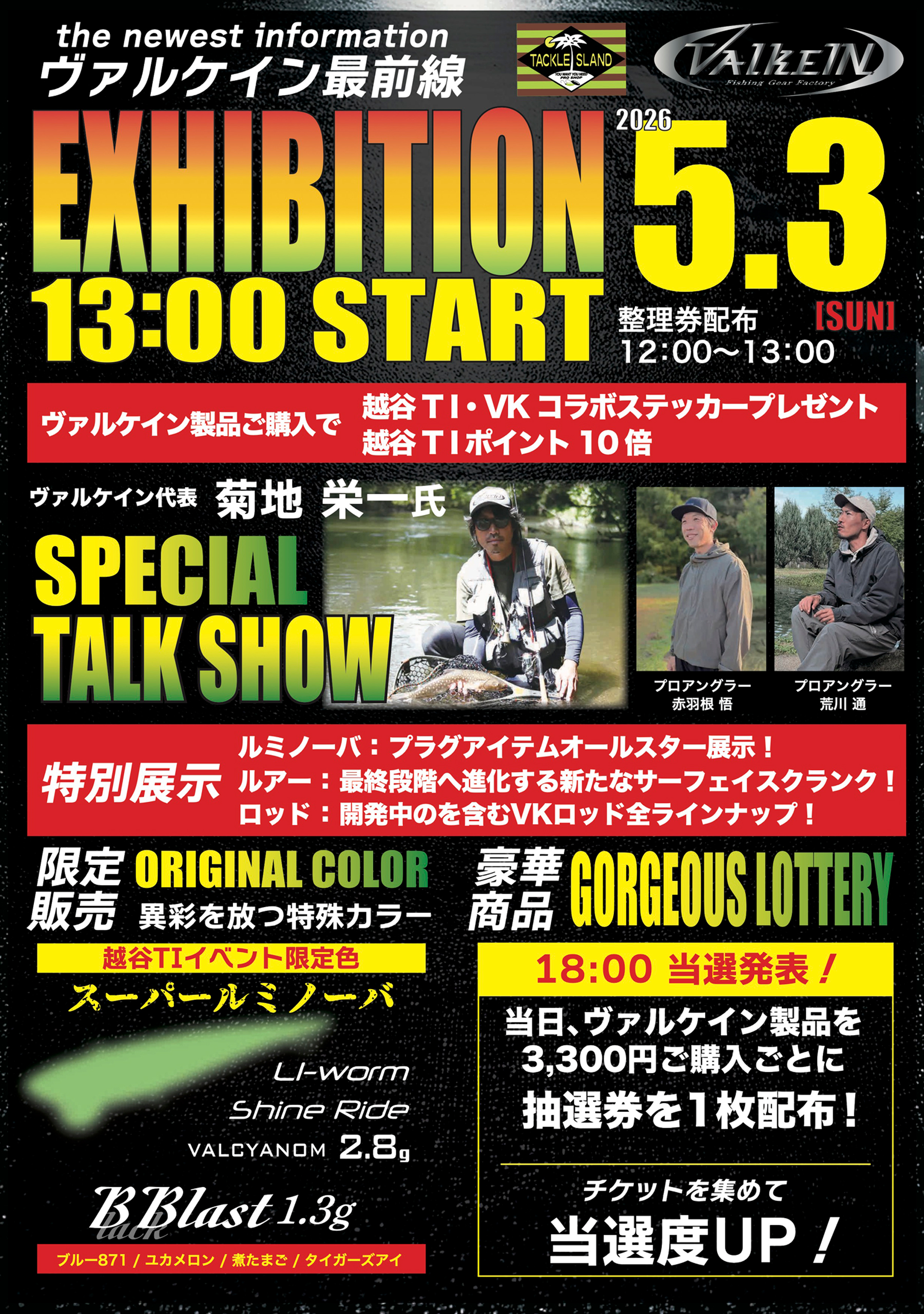 当日は、ヴァルケイン代表 菊地栄一によるSPECIAL TALK SHOWをはじめ、プロアングラー 赤羽根悟・荒川通も参加予定です。