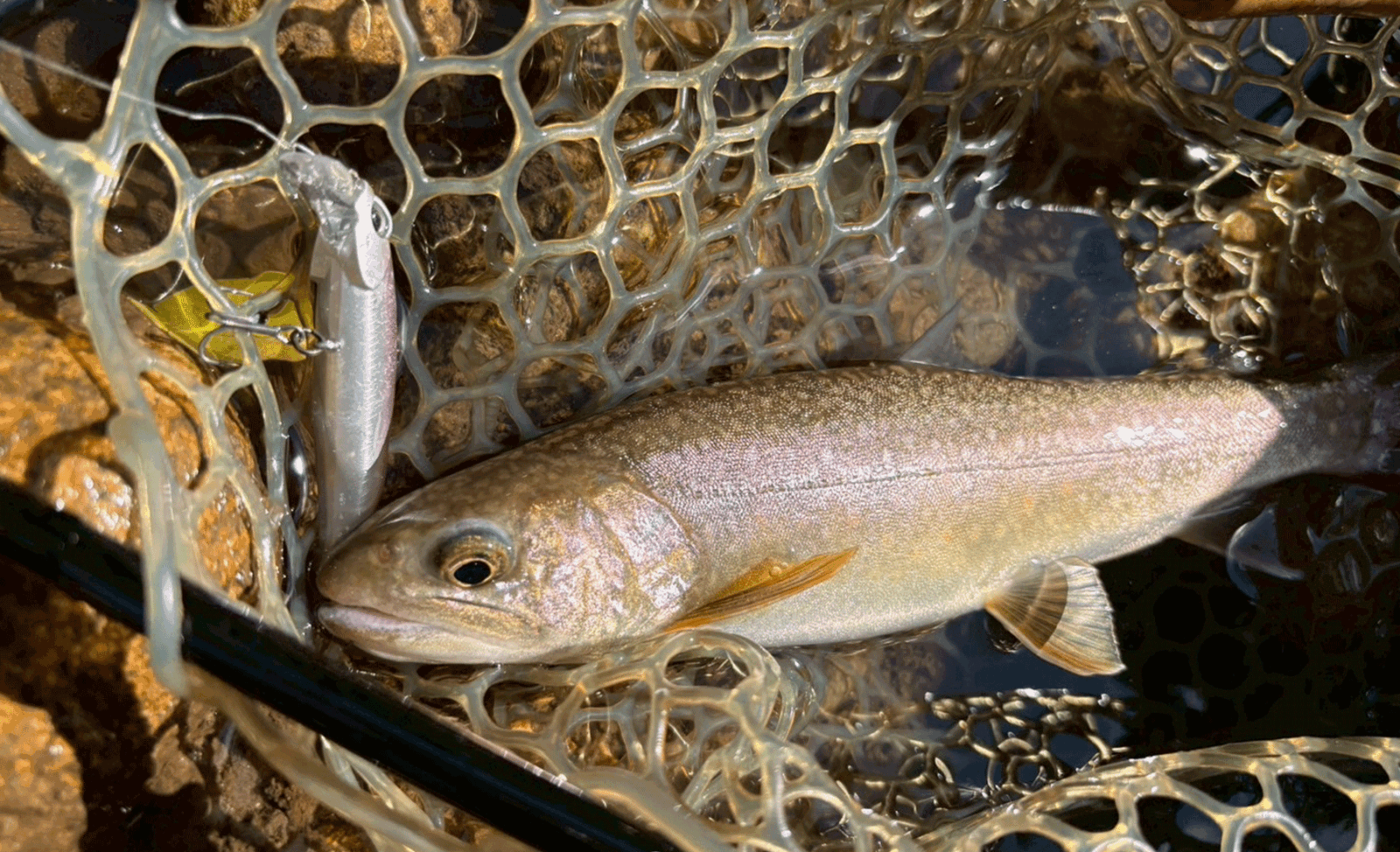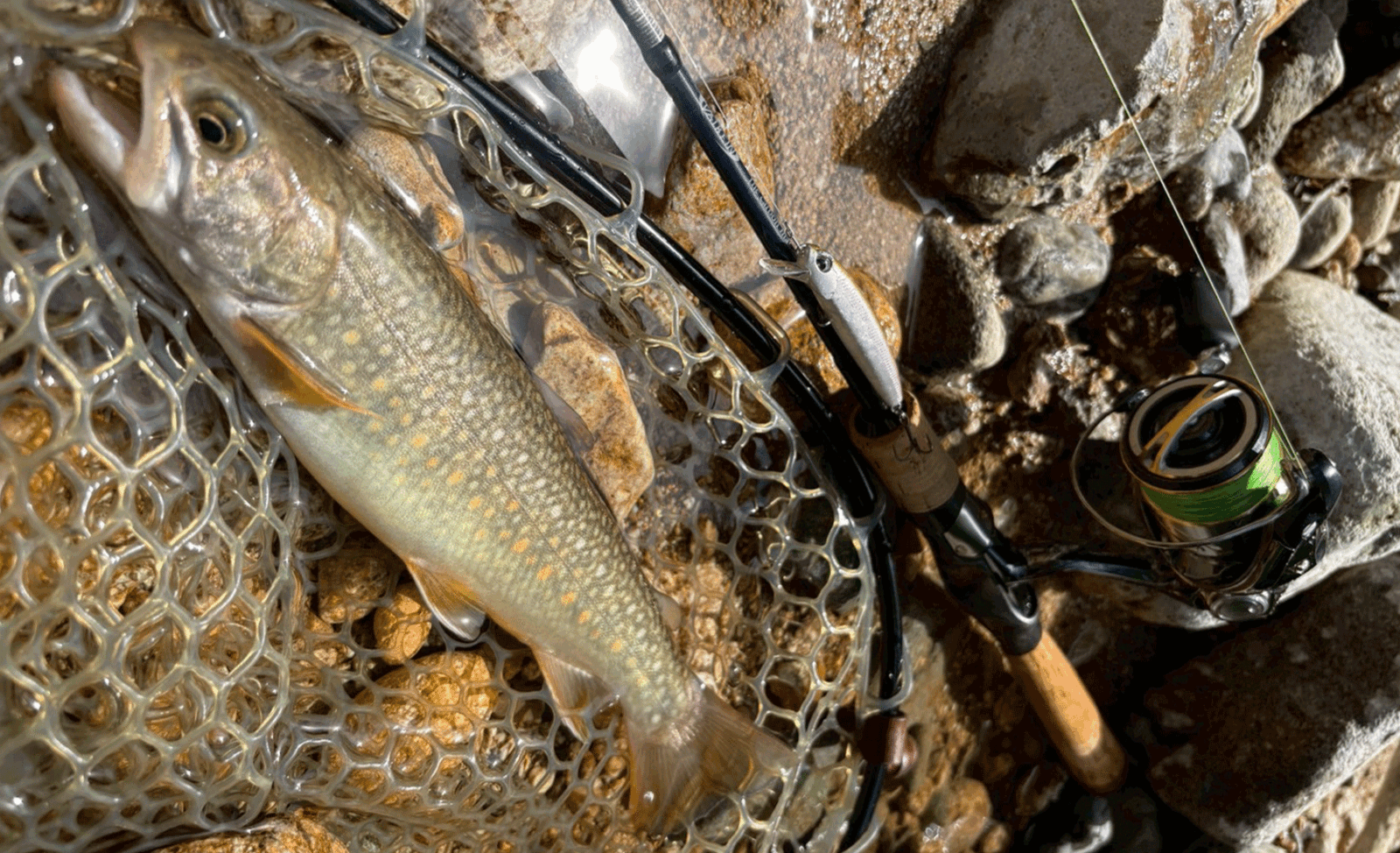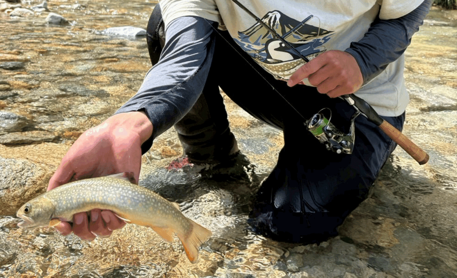 水中をすり抜けるイワナの影が太陽光を反射し、宝石のように煌めく。